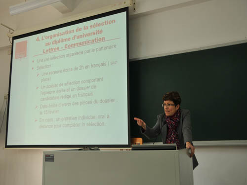 来自司汤达大学的副校长Laurence Garino-Abel 首先介绍了此次合作的目标和相关的组织机构,接着具体解释了学生到法国后将接受的专业教育和相关课程安排的数量、形式,以及到法国学习的名额选拨的时间和方式,最后还解答了学费和在法的住宿问题。