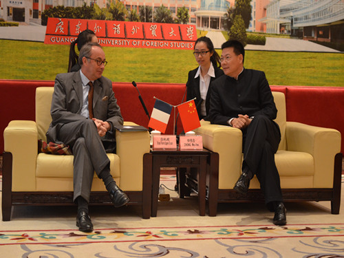 的大力支持,同时对总领事馆,尤其对白总领事本人表示衷心感谢。西语学院法语专业在华南地区首屈一指,为经济发展以及对外交流培养了大批优秀人才。仲校长尤其谈到了法国广州总领事馆对“欧罗巴”文化节的大力支持,借助这一传播欧洲文化的平台,西语学子充分展示了自己的才华。仲校长提到,总领事馆对广外的发展非常重视,先后三位教授被法国政府授予骑士勋章。在此,他特别强调了郑立华教授带领的团队对中法企业的跨文化研究做出了巨大贡献。
