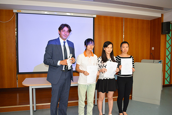 做演讲。接下来,他亲自为本届斯特雷佳文学奖入围作品笔译比赛获奖的同学颁奖并给予祝贺。两位获奖代表还在现场朗读她们的作品内容,以此鼓励同学们更加努力地学好意大利语。