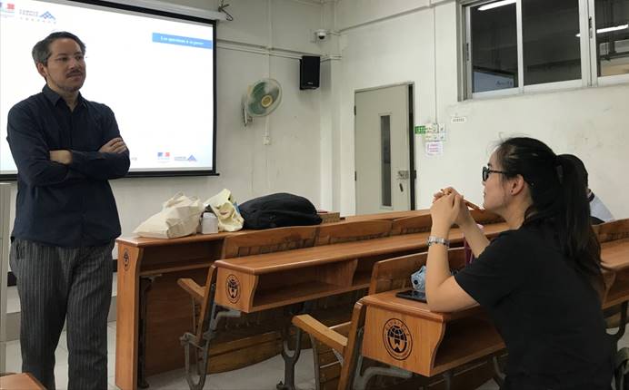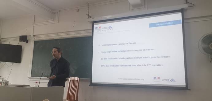 讲座内容分为三大部分:Nylam Gauthier先生首先简单介绍了法国高等教育署的三大主要职责,使同学们对其服务范围有所了解;接着通过分析在法留学生相关数据、介绍政策便利、列举专业类别,向同学们解释选择法国的原因;随后他就留学申请流程对大家进行了指导,重点提及面试、语言水平测试及签证类型。