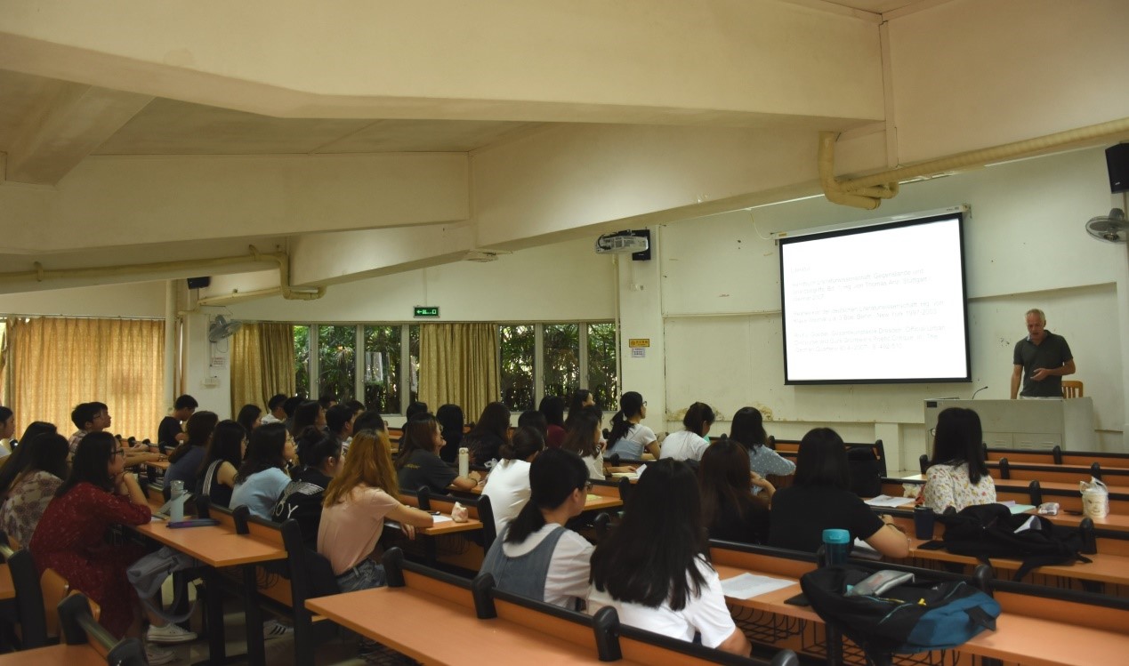 报告的最后是提问环节,针对同学们还没有理解透彻的问题向教授提问。塞德尔教授也十分耐心地给予了回答。报告在热烈的气氛中结束。本次学术报告,大家认真听讲,积极参与,踊跃发言,让大家对文学有了新认识,为日后在研究日耳曼文学的路上高歌向前打下了坚实的基础。