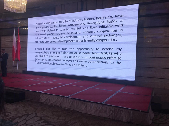 广东省副省长陈良贤在讲话中表示,中波近年来贸易往来蓬勃发展,两国关系蒸蒸日上,两国有望进一步巩固与加强合作关系。同时,陈省长也大力肯定了广外波兰语系的教学成果,指出了当今波兰语人才在广东省的稀缺性和重要性,希望广外再接再厉,培养更多优秀的波兰语人才,为加强双边经贸文化来往贡献力量。
