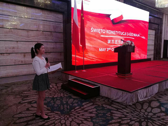 院长杨可教授、波兰语系主任茅银辉教授、青年教师张和轩、外籍教师Agnieszka Jasińska以及波兰语四年级学生参加波兰国庆节招待会。出席本次活动的有波兰共和国驻广州总领事约安娜•斯科柴克女士(Joanna Skoczek)、广东省副省长陈良贤、广东省人民政府外事办公室副主任罗军,以及其它领馆的官员、居住在辖区的波兰公民等。波兰语系大四学生张慧玲担任本次活动的主持人。