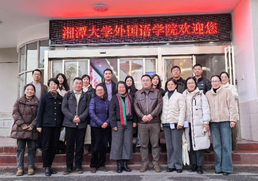 当天下午,调研团队前往湘潭大学外国语学院进行交流。湘潭大学外国语学院院长舒奇智、党委书记李锋及相关系部负责人出席了座谈会并详细介绍了学院在课程设置、教学改革及学生培养方面的创新举措。