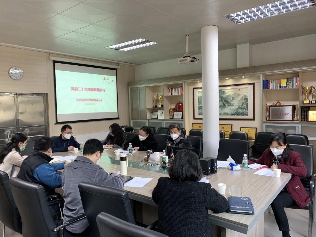 2023年1月3日,西语学院召开党委中心组党的二十大精神专题学习会,学院党政领导班子全体成员、书记助理、教师党支部书记等参会,会议由学院党委书记王秀民主持。
