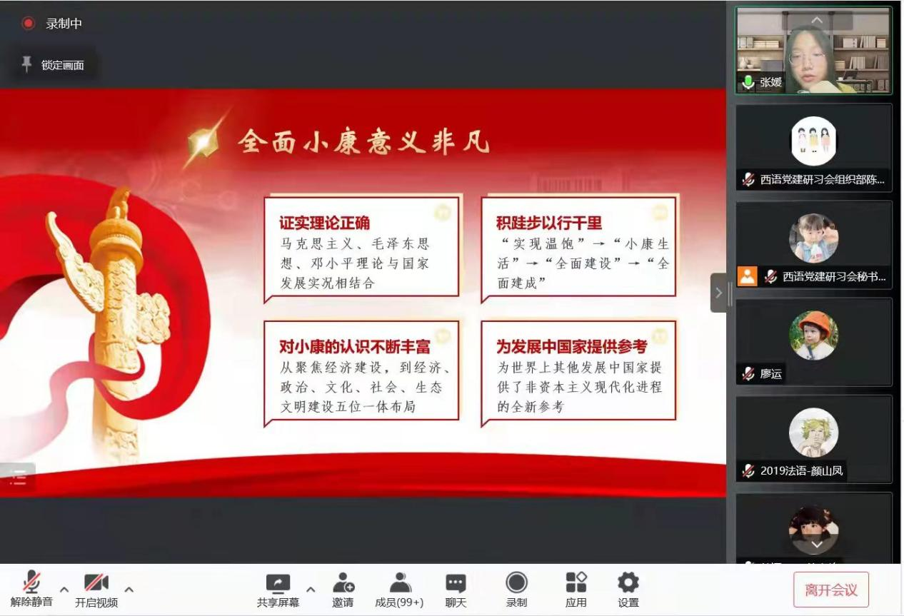 2021年11月4日下午16:00,西语学院邀请“百年党史大学生宣讲团成员、高级翻译学院张媛为学院党员学生开展题为“全面建成小康社会——伟大探索与实践”线上专题党课,共计158名党员参与。