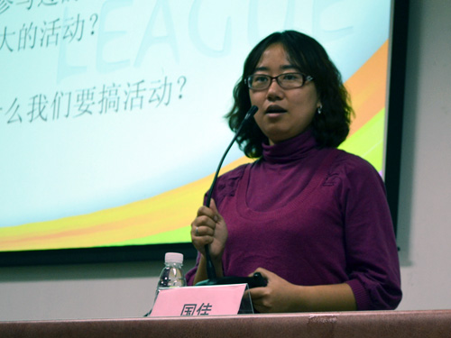 本网讯 2012年校团委拟定专题、组织讲师团,对各学院学生干部进行培训。10月31号晚,西语学院邀请到团校培训讲师、校团委副书记国佳老师在四教424为西语学院的学生干部们进行培训,主题为“团学活动的策划与组织”。西语学院党委副书记郝建萍老师出席了本场培训会。活动由西语学院团委书记张璇老师主持。