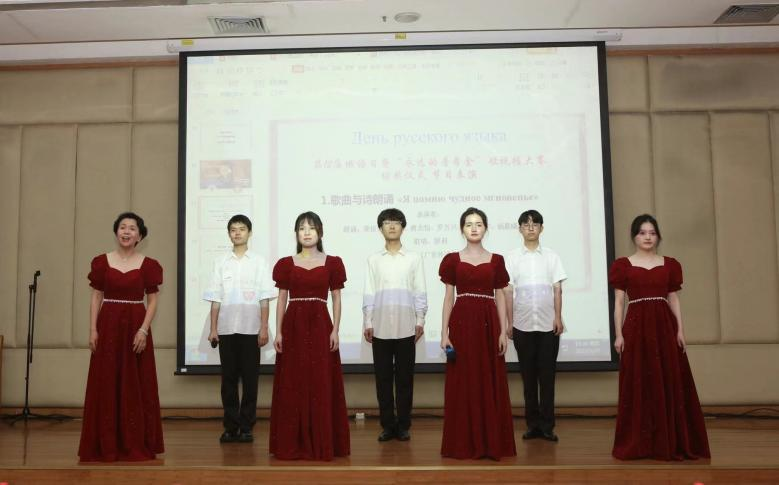 俄语系研究生赵阳洋、尹新霆主持。来自各院校的师生以及广州红星歌舞团的演员们通过歌曲、诗歌朗诵、视频演绎、吉他弹唱等方式纪念《叶甫盖尼·奥涅金》问世190周年,表达对俄语、对俄罗斯文化与文学的热爱,为现场观众带来精彩演出,也为第12届“俄语日”活动画上了圆满的句号。