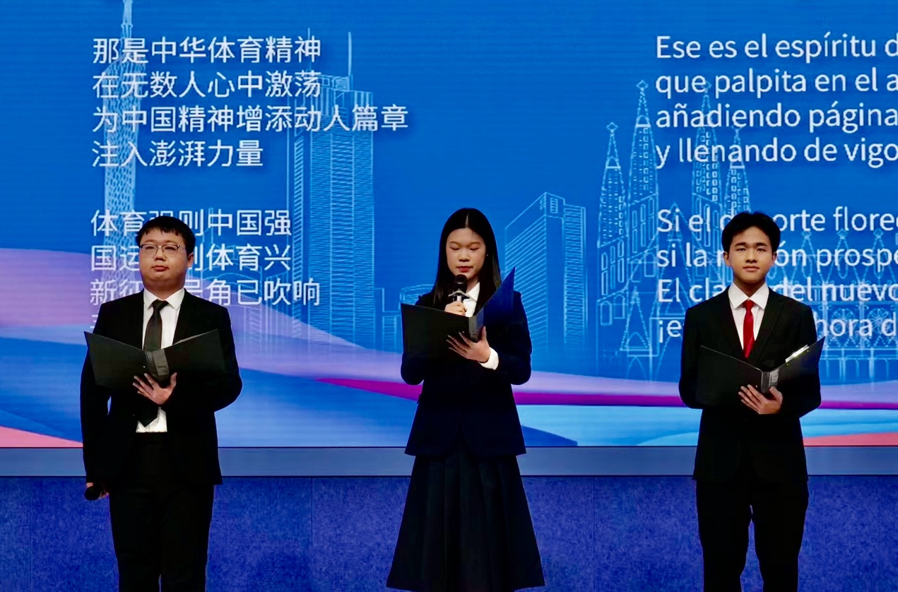 29日下午,广外西班牙语系师生由孙嘉星老师带队参与了“联通融合 相聚全运——中外友人体育文化交流故事会”分享会。张志智老师和张梦璐老师负责现场同声传译,吴凡老师和孙嘉星老师承担了《中华体育精神颂》的西班牙语翻译工作,西班牙语口译专业研究生陈茂倩全程参与了翻译服务,本科学生陈汉林、陈志杰和林灵分别朗诵了西班牙、阿根廷和中国的诗歌选段,展现了东西方诗歌的韵律之美。分享会结束后,广外师生协助中方代表与外国嘉宾对话,双方围绕文学发展、文化背景及创作灵感展开讨论,并协助为十五运会录制祝福视频。活动中,广外师生的翻译服务让本次对话更加深入且富有成效。