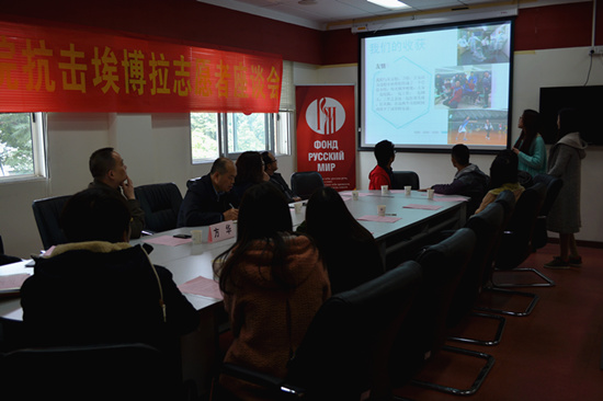 本网讯 2015年1月9日,西语学院抗击埃博拉志愿者座谈会在四教三楼俄语中心顺利召开。校党委副书记卢景辉,西语学院党委书记方华,西语学院院长杨可,学院党委副书记陈华荣,副院长杨晓敏,辅导员李媛、陈静出席本次座谈会。抗击埃博拉志愿者小组成员参加会议。