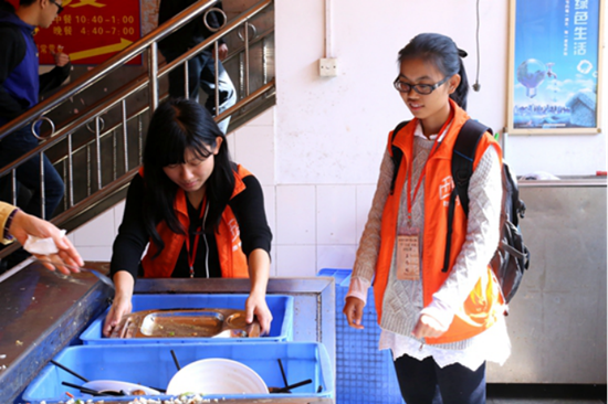 志愿者们耐心地指引前来放餐具的人把餐具放在正确的位置。尽管盘子上有油污,但是每次有放错位的餐具他们能都一一摆放好。由于工作时间是饭点,他们都只能推迟自己吃饭的时间。即便这样,每一位西语学院志愿者都依然坚持着认真的态度从头到尾一直坚持在岗位上,从不懈怠。
