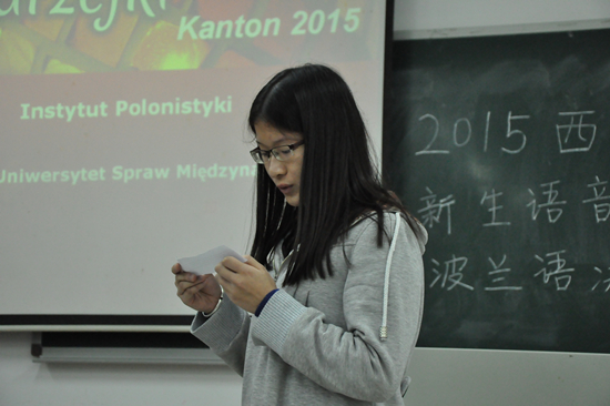 的波兰留学生克里斯蒂娜•米克什科(Krysiatyna Mikśko)。外教阿格涅什卡•雅辛斯卡(AgnieszkaJasińska)老师和大二学生张慧玲作为主持,有序地组织了比赛。