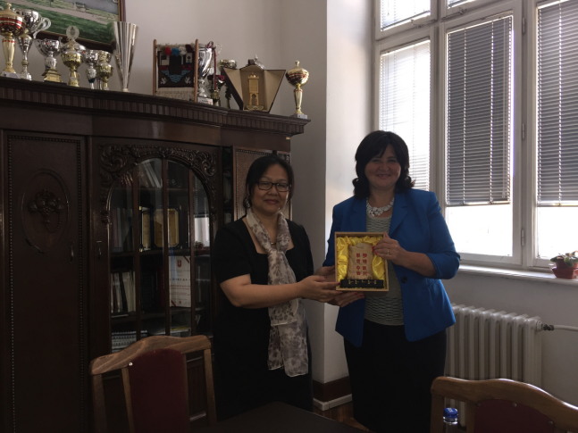 杨可院长向贝尔格莱德大学语文系主任赠送广外纪念品