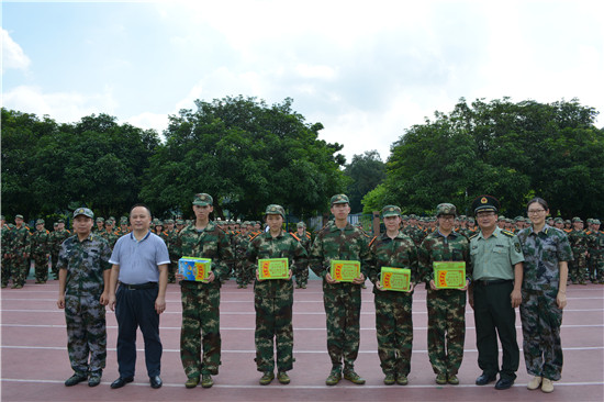 本网讯 2016年9月1日上午,西语学院军训慰问活动在广外北校大操场进行。西语学院党委书记方华、党委副书记陈华荣和辅导员王斌龙、刘甜甜出席了本次活动。