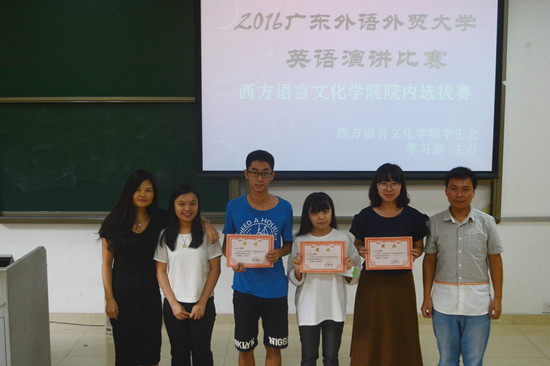 所有参赛选手演讲结束,比赛接近尾声。评委们上台发言,他们赞扬了各参赛选手的出色表现,并提出了积极的建议。最后,由主持人宣布赛果,比赛嘉宾及评委分别为获奖选手颁发荣誉奖状。至此,2016年英语演讲比赛之西语学院院内选拔赛圆满结束。
