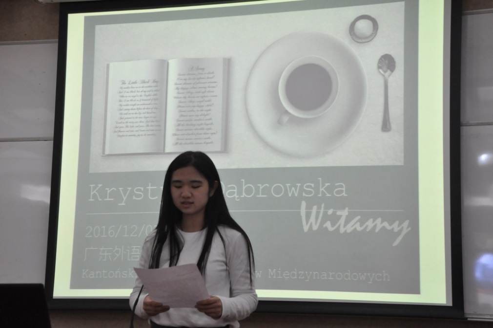 为了感谢克里斯汀娜·冬布罗夫斯卡的到来以及表达对她的喜爱,5名波兰语系大二学生上台朗诵了她的诗歌,获得了克里斯汀娜女士的赞赏。