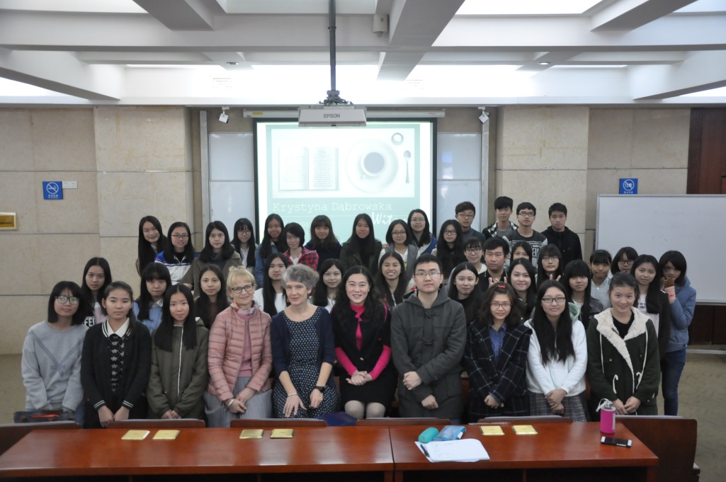 为波兰语系师生开讲座。出席本次讲座的老师有波兰语系系主任茅银辉老师,外教阿格涅什卡·雅辛斯卡(Agnieszka Jasińska)以及青年教师张和轩。在讲座上,克里斯汀娜女士向大家介绍了波兰诗歌在形式和题材上的发展历程以及目前诗歌在波兰的发展状况。