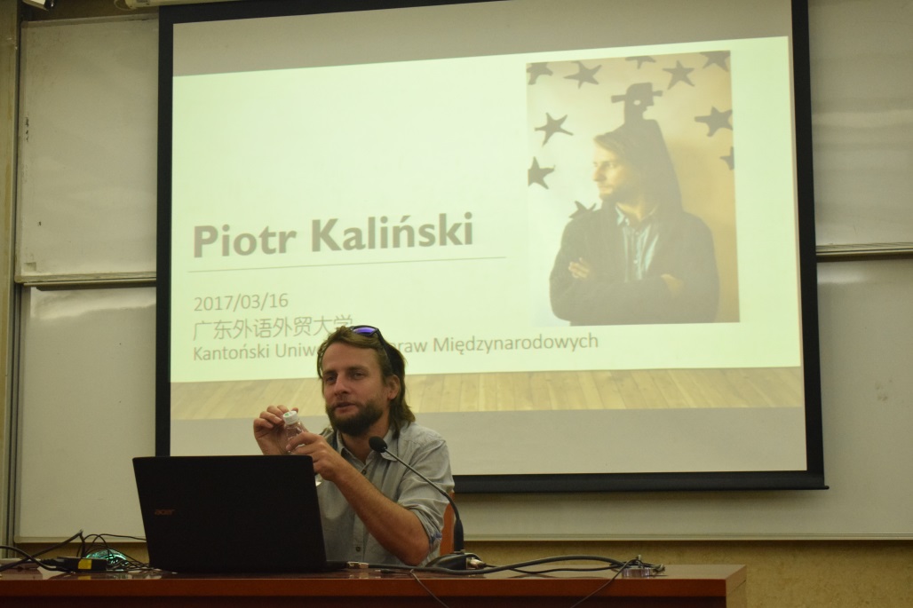彼得•卡林斯基向大家展示了他的家乡——欧洲著名城市克拉科夫的风采,包括其自然景色和人文风光。他还介绍了扬·马特伊科(Jan Matejko)和约瑟夫·查普斯基(JózefCzapski)等众多对他产生了重要影响的波兰画家。此外,卡林斯基通过展示图片视频和讲述自己在法国、中国的经历,向大家详细地介绍了他成立的书店、自己的工作过程和一系列作品,引起了大家对插画图绘的兴趣。同学们纷纷向他提问关于其作品和绘图的问题,现场气氛十分活跃。
