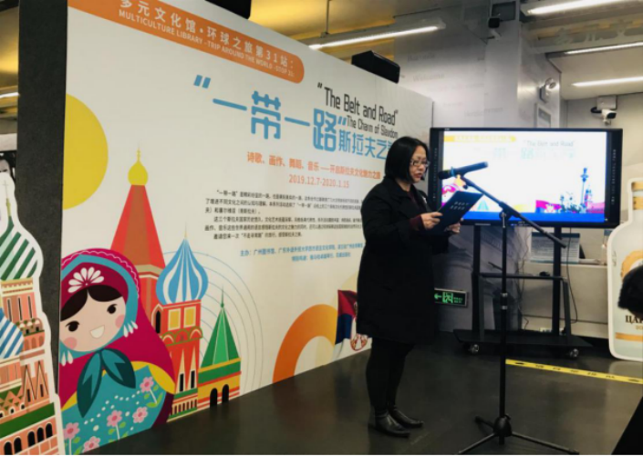 开幕式上,广州图书馆副馆长罗小红女士致欢迎辞。罗馆长指出,举办本次活动的目的是为了促进中国与斯拉夫民族之间的文化交流,实现“民心相通”,通过诗歌、画作、音乐等形式向大众介绍充满创意、多彩的斯拉夫文化。