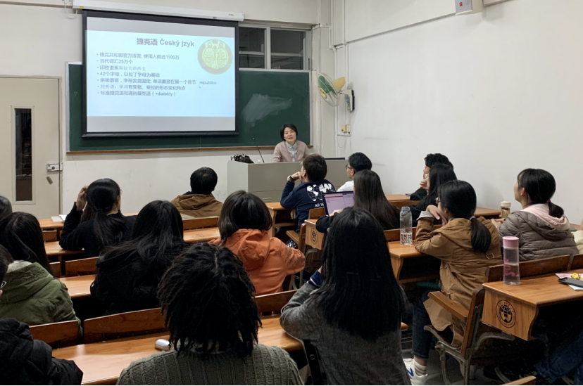 在讲座的第一部分中,徐伟珠老师简要介绍了捷克的国土、国旗、国徽、国歌、政体等基本的国家组成元素,随后讲述了捷克语的“前世”与“今生”,剖析捷克语的起源、发展历程及其影响力。在第二部分里,徐伟珠老师利用图片、音频等多媒体形式,绘声绘色地向学生介绍了捷克的文化风情、建筑艺术和文化遗产。捷克国土虽小,却有多达14处文化和自然遗产被列入联合国世界遗产名录,彰显出捷克人对待文化的尊重和保护。在第三部分里,徐伟珠老师重点讲述了波西米亚地区的文化代表人物。捷克地处欧洲心脏地带,是欧洲最重要的交通枢纽之一,更是东西欧文化激流碰撞、交汇的地方,于此诞生了不少在世界上拥有重要影响力的文化人物,如作家米兰·昆德拉和弗兰兹·卡夫卡、音乐家安东·利奥波德·德沃夏克、教育家夸美纽斯等。