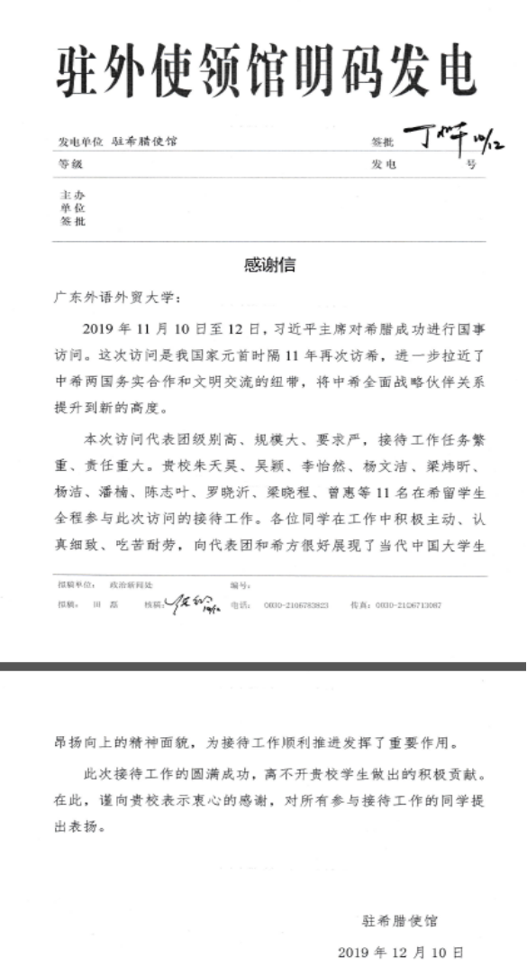 2019年11月,习近平主席对希腊进行国事访问,该专业17级在希留学生全程参与访问接待工作。这些同学在接待工作中积极主动、认真细致、吃苦耐劳,向代表团和希方很好地展现了当代中国大学生昂扬向上的精神面貌,为接待工作顺利推进发挥了重要作用。我驻希腊使馆特向污污漫画