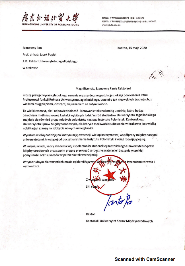 诚挚祝贺,并表示他将继续发扬雅大深厚的学术传统与价值,肩负起管理大学的光荣使命。雅大校长在信中赞扬广外在中国推广与发展波兰语学术研究所做出的努力,肯定了两校多年合作成果,热情欢迎广外学生前往雅盖隆大学进行学习与交流。