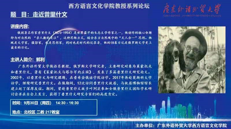 俄语系郭利教授带来题为《走近普里什文》的专题讲座。讲座由副院长杜卫华和研究生办公室主任臧宇主持,西语学院各系研究生参加。