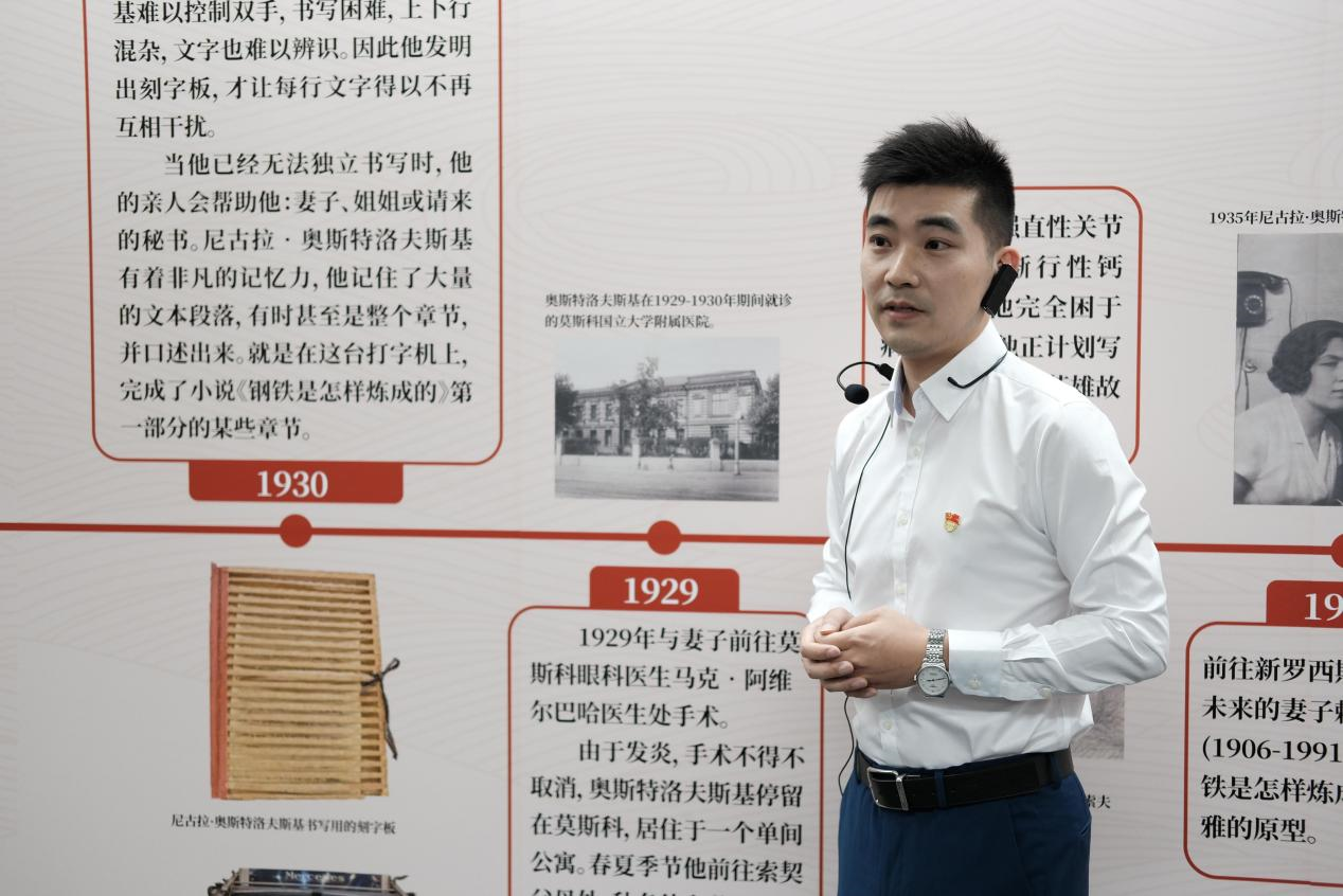 在活动上,首先由俄语系费俊慧老师和研究生温圣选共同担任“红色领读人”,为公众开展双语导赏,重温经典背后的革命精神。接着,21级俄语口译硕士班同学现场献唱苏联经典歌曲《红莓花儿开》,并朗诵《钢铁是怎样炼成的》原著经典选段,为读者营造立体沉浸式的观展体验。