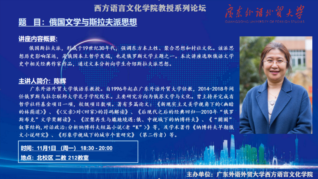 俄语系陈辉教授带来的《俄国文学与斯拉夫派思想》。讲座由研究生办公室主任臧宇老师主持,西语学院各培养点研究生出席。