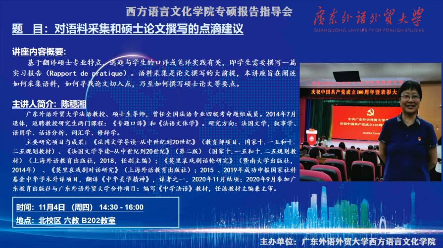 陈穗湘教授把指导会的内容主要分成了以下几个部分:论文选题及其要求、MTI论文与MA论文的区别、语料采集的方式、论文的谋篇布局及各部分格式,并强调了学风问题。