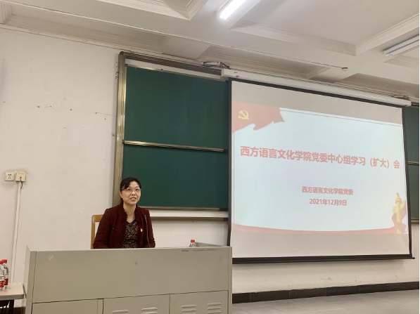 根据学校《关于做好学习贯彻党的十九届六中全会精神的通知》要求,2021年12月9日下午,西语学院党委邀请马克思主义学院副院长崔艳红教授开展主题为“百年成就与宝贵经验——党的十九届六中全会精神解读“专题宣讲。西语学院全体教职工及学生党员、入党积极分子参加本次学习大会。宣讲会由学院党委书记敖湘晖主持。
