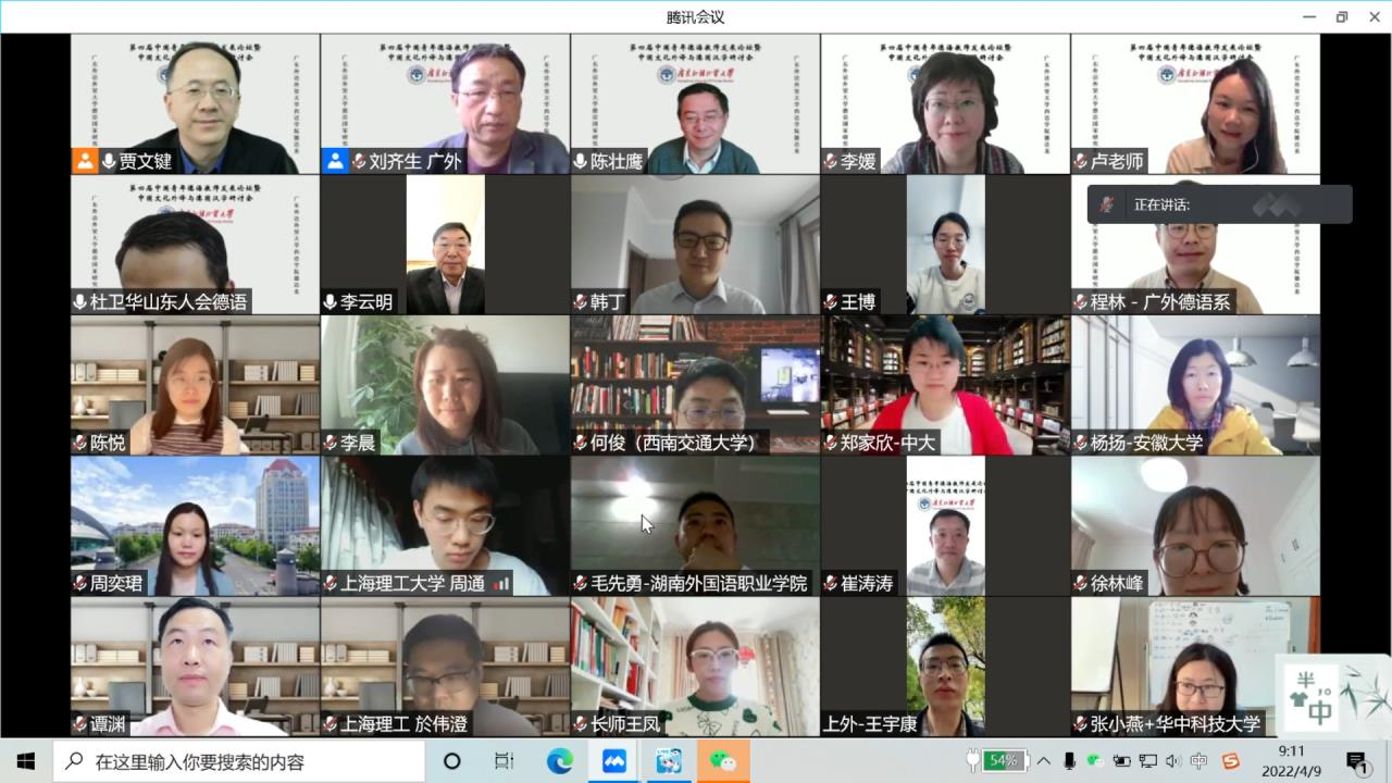 主办的“第四届全国青年德语教师发展论坛暨中国文化外译与德国汉学研讨会”顺利在线举办。学校党委李云明副书记、北京外国语大学贾文键副校长先后致辞,国内外众多从事中国文化外译的学者和研究生在腾讯会议平台参加了研讨会。会议开幕式由西语学院杜卫华副院长主持,刘齐生和卢铭君分别主持了大会报告。