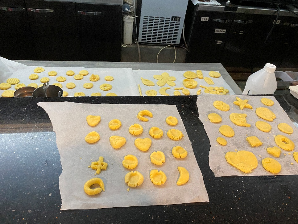 随后,老师们五人一组,开始制作曲奇。组员们纷纷发挥自己的想象与创造力,将黄油面团揉捏塑造成各种形状并绘上特色花纹。半成品摆上桌,大家互相欣赏并帮忙完善,其乐融融。