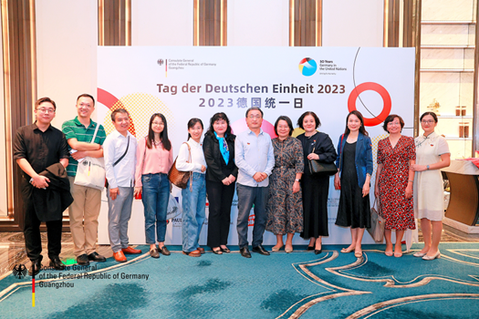 本网讯 2023年10月25日,德国驻广州总领馆在广州丽思卡尔顿酒店举办盛大的国庆招待会,西语学院党委书记王秀民、副院长卢铭君和德语系全体教师受邀参加活动。