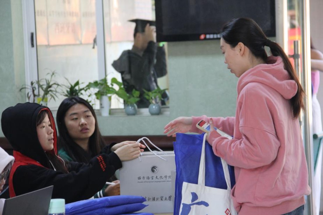 为保证此次活动顺利进行,西语学院的志愿者们早早地在校友返校前做着筹备工作。他们身穿红色的志愿者马甲,在主校道、四教中庭摆放好签到桌椅,整齐地排列好学位服、赠与校友的纪念品,以最饱满的状态等待校友们的到来。