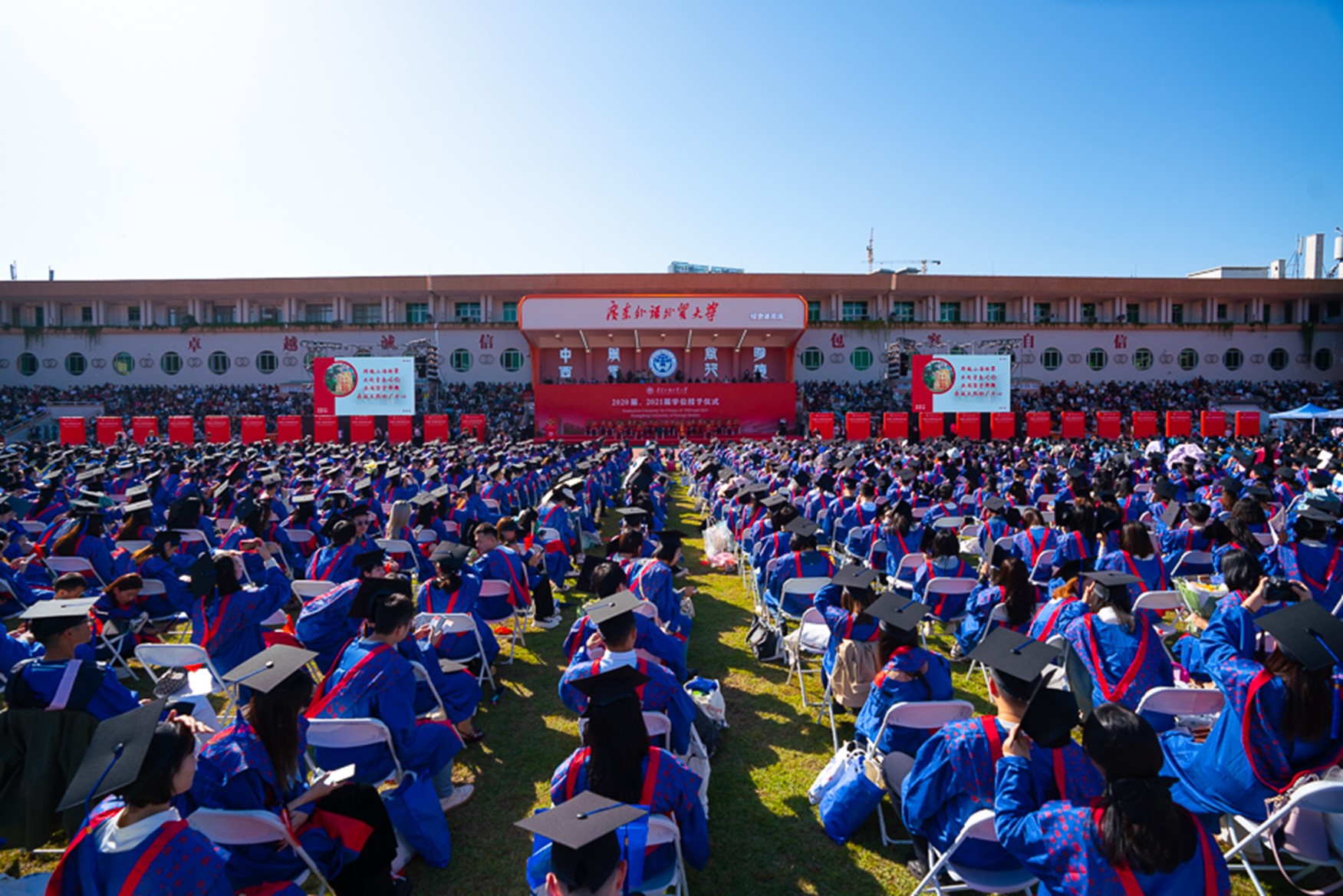 下午,学位授予仪式在修缮一新的综合体育场上如约而至。红旗飘飘,扬起我们的情怀;歌声朗朗,唱响青春的活力;草地上的椅子整齐排列,等候艳阳高照下各学院2020、2021届的校友陆续入场。校友们谈笑风生,笑容如阳光明媚,心情也如天气舒爽;学位服与操场舞台相衬出抹抹亮色,轻轻拨动学位帽上的帽穗,为他们炽热的校园生活画上了圆满的句号,但青春的美好与激荡仍在,他们亦将迎来属于自己的愈加美好的篇章。
