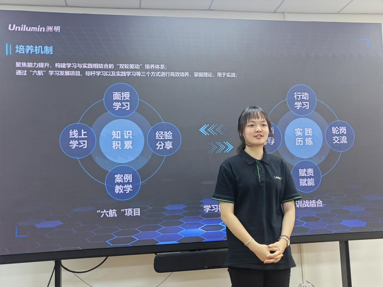 洲明员工代表、西语学院23届毕业生岑钰瑶做分享