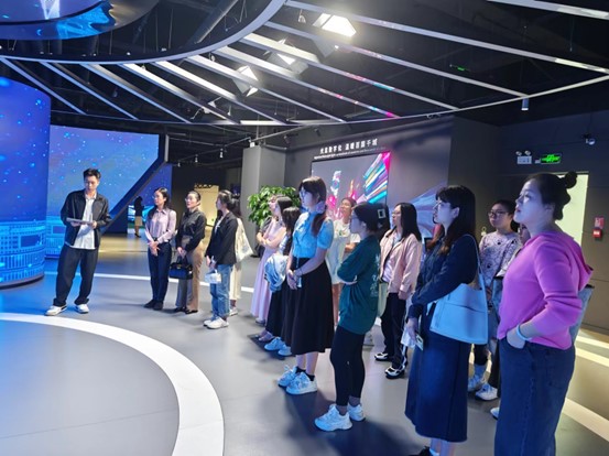 到达目的地后,在洲明员工、西语学院23届希腊语校友梁健佳的带领下,师生们先是参观了企业的展厅,了解了光显技术的演进历程和洲明产品的经典应用场景,还亲身体验了先进光显技术的魅力。