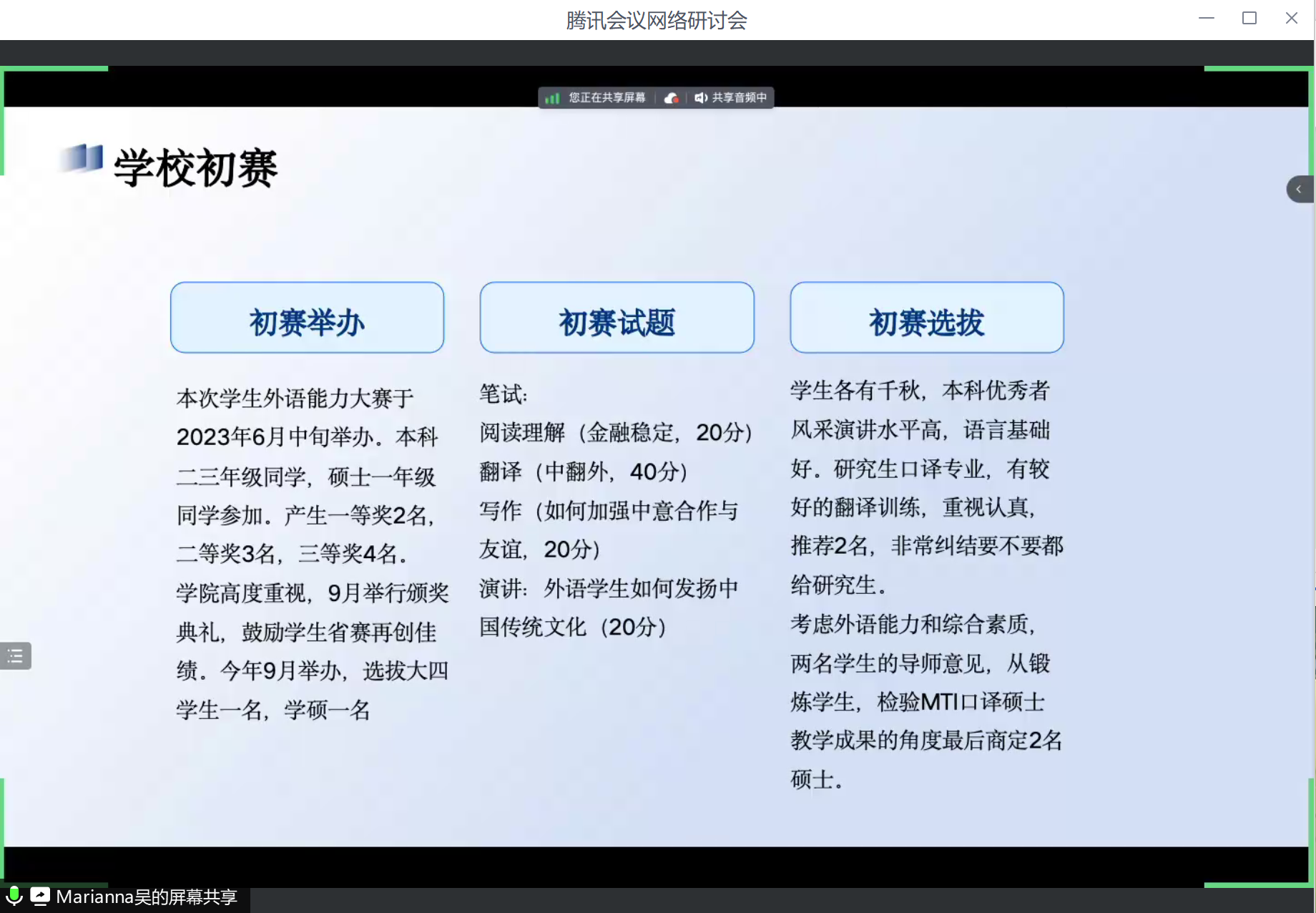紧接着,吴菡老师展示了对外经济贸易大学校内初赛的筹备与选拔情况,参考大赛样题设计模拟试卷进行选拔,尽可能将机会平等给予各个学段的学生。另外还结合贸大特色专业课程与教学,向西语学院师生分享了三个观点:一是要在语言教学的过程中向学生传达宏观层面的知识,帮助学生提升眼界,形成自己对时代、对自身的思考与认知,找准自身定位,锚定发展目标;二是关注中国特色大国外交话语的表达,以求达到政治性、平衡性、动态性的“政治等效”;三是在具体的教学场景中要多加留意不同的文化差异下应采取不同的翻译方法。接下来,吴菡老师向我们介绍了贸大的课程培养与教学方法和成果,并通过具体案例展示了“理解当代中国”系列教材的教学方式,着重指出“口译需要大量的实践”,传道授业的过程中既需要多元化教学方法,还需要个性化学习支持。