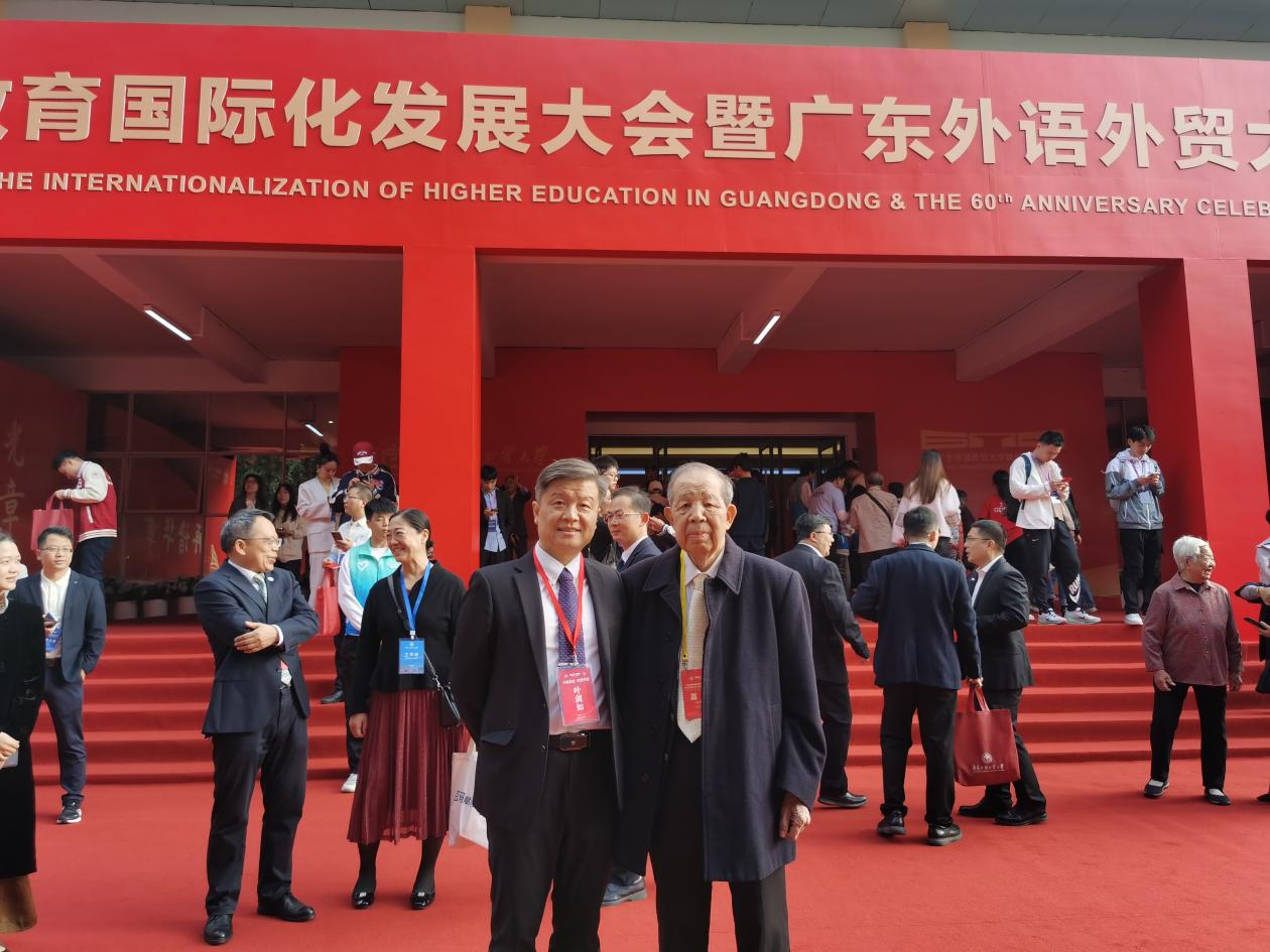 法语65级校友,原云浮市委书记温耀深(右)回校参加60周年校庆活动,法语系主任叶剑如(左)陪同