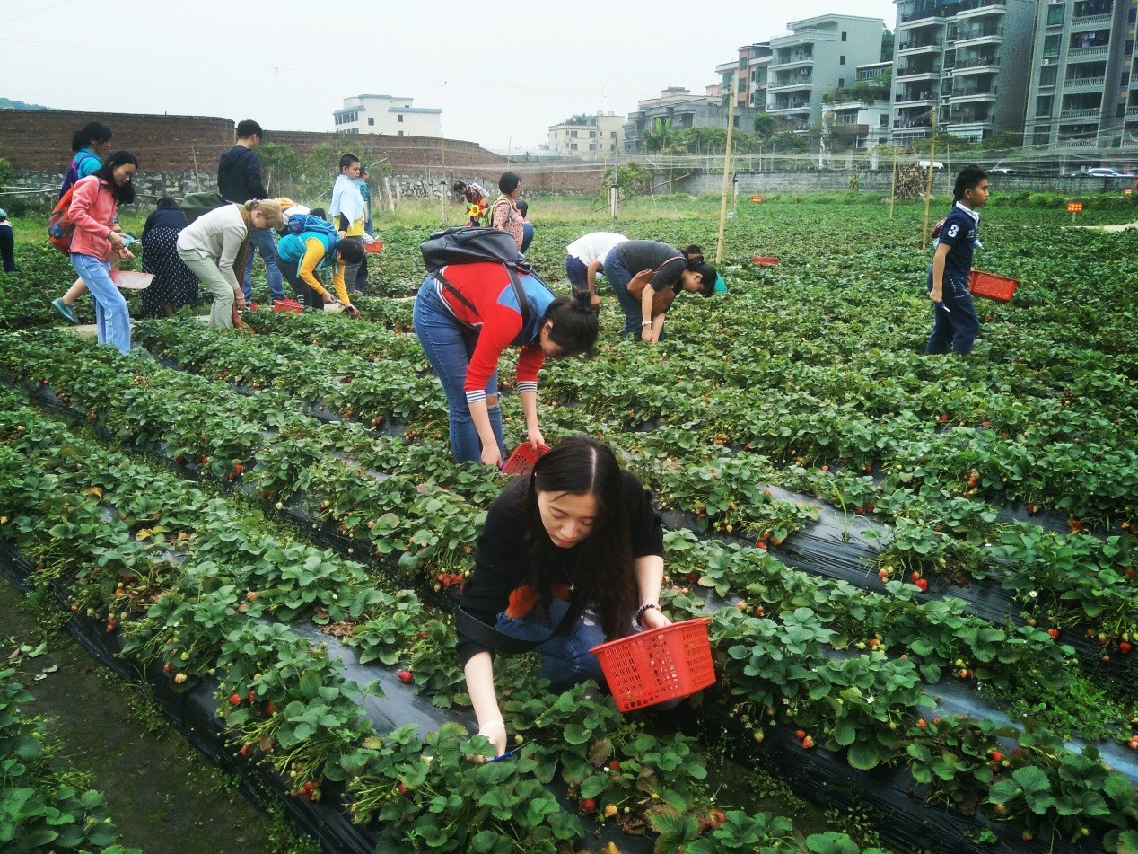 下山品尝过农家菜后,大家乘坐大巴前往山水草莓园,进行摘草莓活动。新鲜的草莓,色彩艳丽、香味诱人。大家一边采摘一边品尝,相互交流,互相拍照,充分感受清新的田园气息,体验动手的快乐和收获的喜悦。