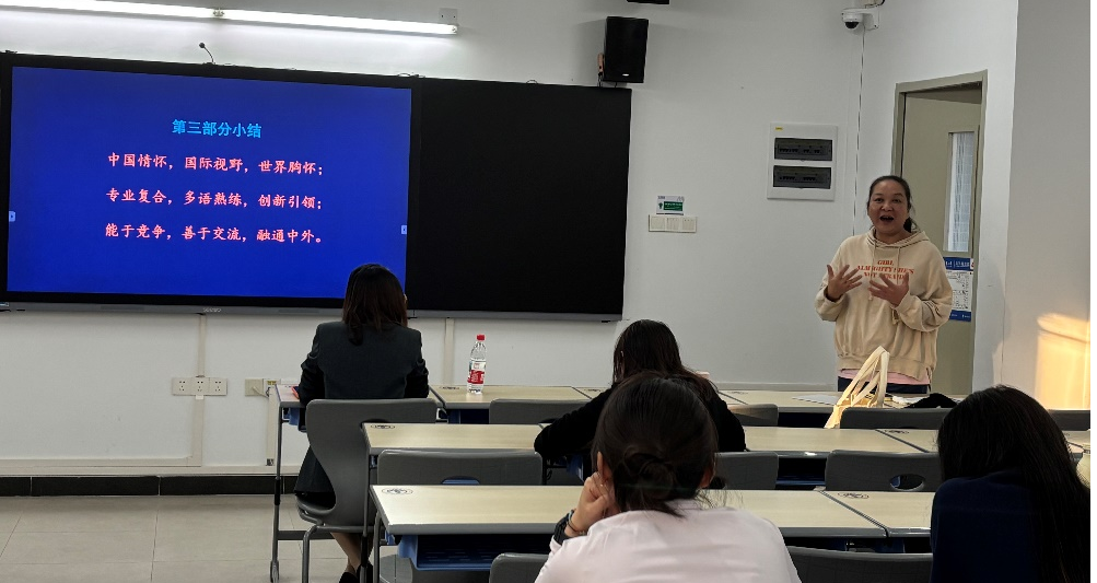 讲座最后,杨晓敏院长对本次讲座进行了总结。杨院长首先感谢了马老师的精彩分享。随后杨院长强调指出外语是当代人才不可或缺的核心能力,同学们应不断提升复语素养。杨院长提到学院目前已推进本科教学改革,探索“外语+专业”的双学士培养模式,拓展更多发展路径。最后杨院长总结:这次讲座拓宽了同学们的视野,希望大家进一步明确目标、持续提升自我。